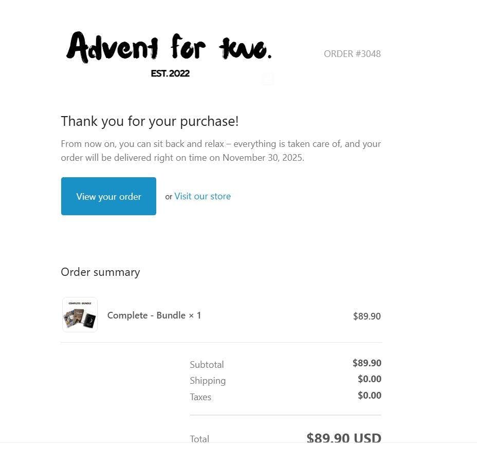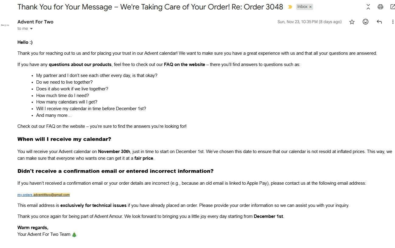 You will receive your Advent calendar on November 30th, just in time to start on December 1st. We’ve chosen this date to ensure that our calendar is not resold at inflated prices. This way, we can make sure that everyone who wants one can get it at a fair price."