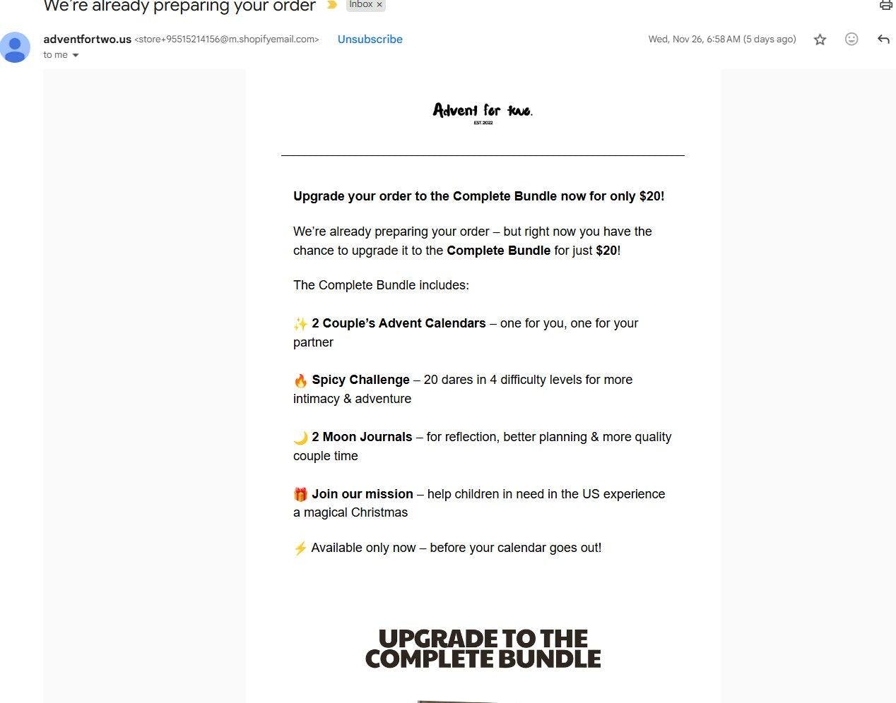- 2 perfectly coordinated Advent calendars, one for you and one for your partner.